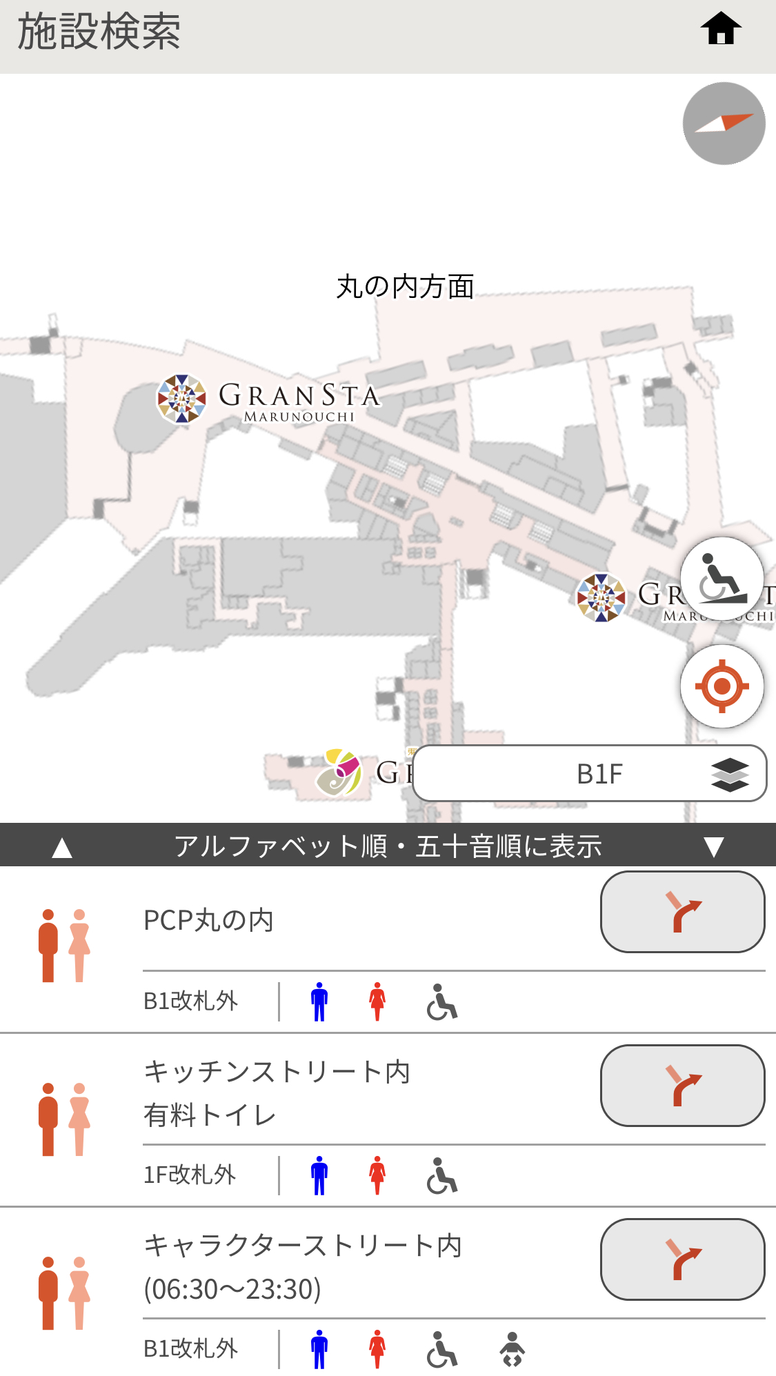 東京駅改札内外の店舗、トイレ、コインロッカー、改札など自分が設定した目的地まで、ルート案内してくれます。そして、ルートはバリアフリー段差解消ルート表示もあります。